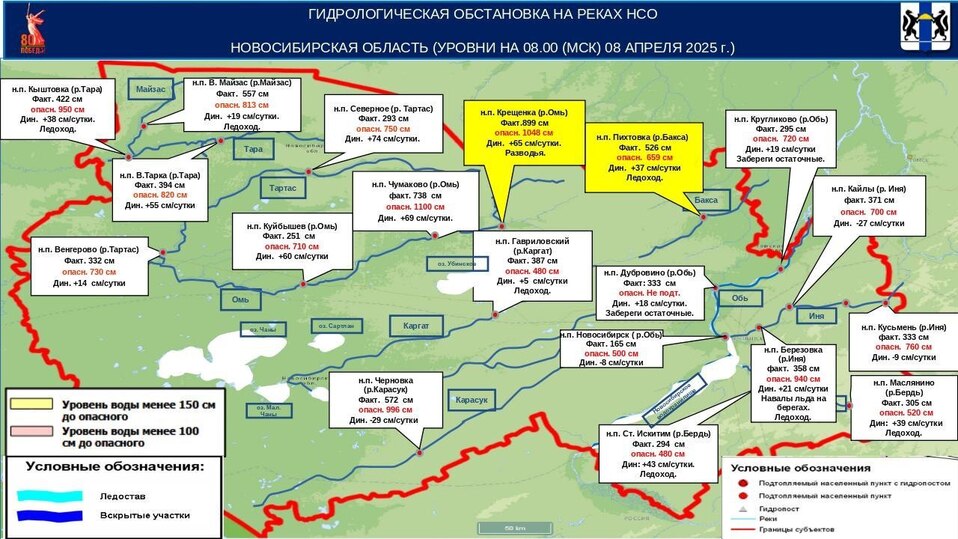В зону повышенного риска, где до опасного уровня остается менее 1,5 метров, попал и города Новосибирск, Куйбышев, а также поселок Венгерово. В Дубровино и Крутиковке местные власти предупреждают население о необходимости соблюдать осторожность у берегов рек, где вода подступает к домам и возможен выход за пределы русел.